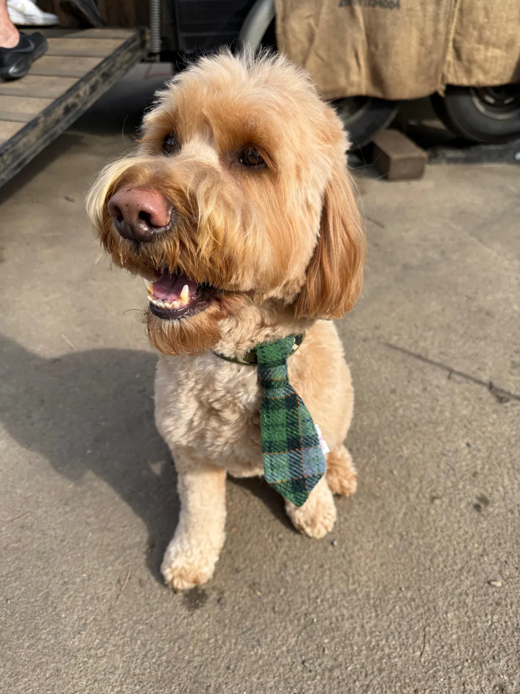 Our dog usually wears bow ties and we came across Bowzos searching for a new one. How have we not come across Bowzis before!!? A fantastic selection of both Bow Ties and Dog Ties +. We chose Green Grass Check and Bute Harris Tweed designs in medium of the Dog Ties for a change, and they give our Doodle a distinguished look but also a cheeky look when the tie hangs off centre. The medium tie hangs about 5.5 - 6 inches from the point of fold and loop over the collar. Our dog is a 17.3kg miniature Goldendoodle. Fits all types of collar regardless of size.
